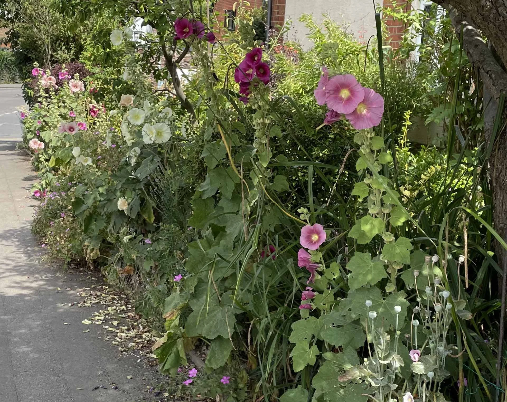 A range of hollyhocks, flowers and grasses provide a nature friendly informal hedge