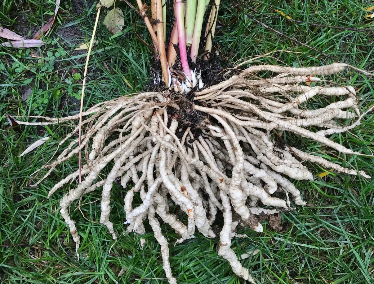 Free-source photo. The once-popular skirret is making a well-deserved comeback. The photo shows a whole skirret plant harvested and washed. The pink offshoots can be carefully removed and replanted to provide next year’s harvest. Pieces of root left in the ground may also regrow.